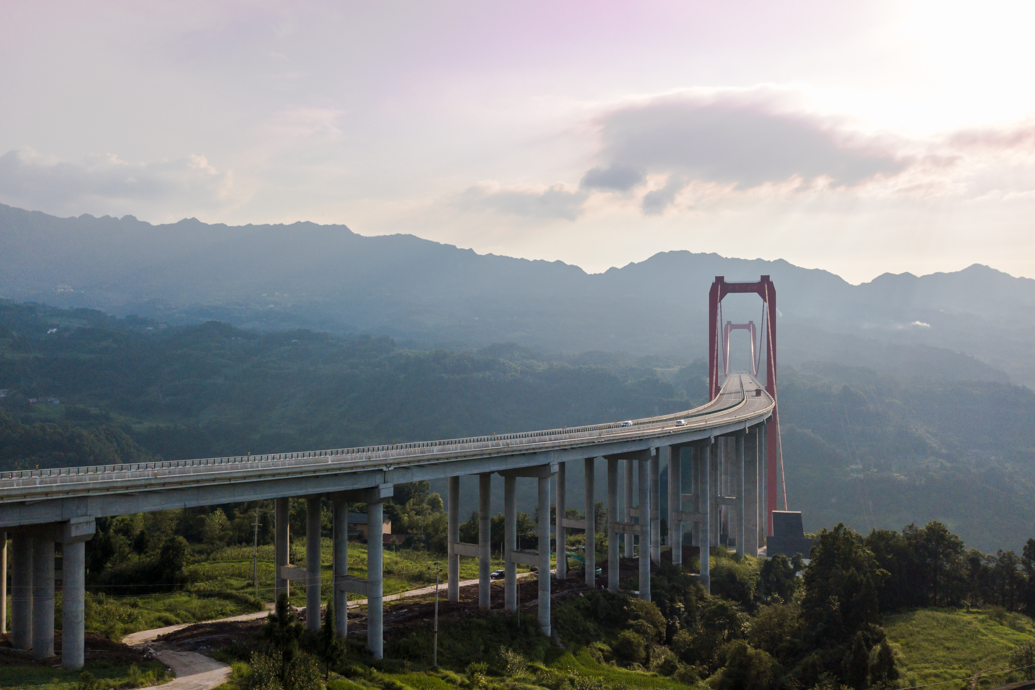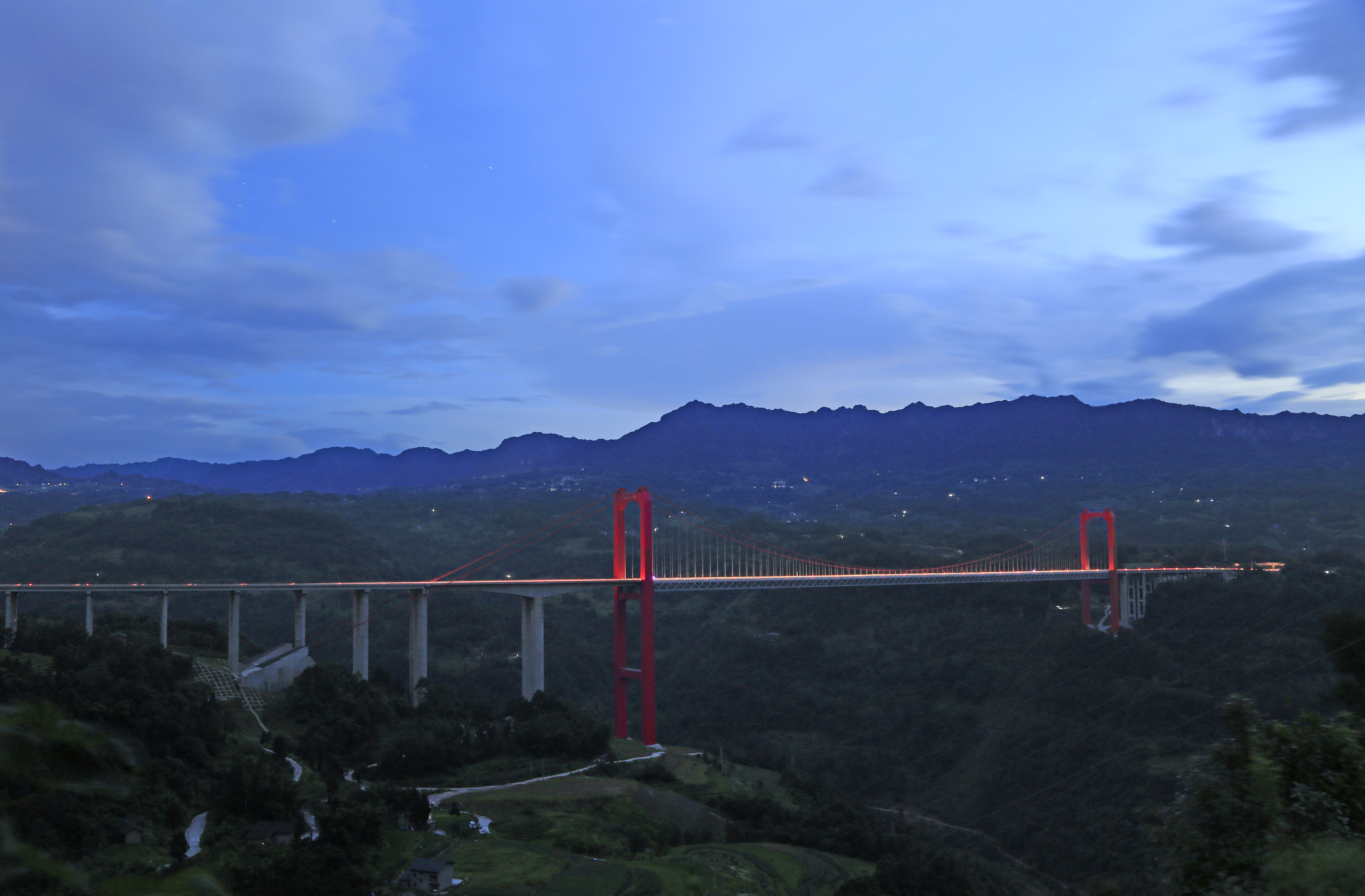 筍溪河大橋橋梁全長(zhǎng)1578米,主橋?yàn)?60m鋼桁加勁梁懸索橋,橋面寬24.5米,最大索塔高190.65米,橋面距河谷達(dá)290米,是重慶市第一高橋,重慶市首座山區(qū)大跨度懸索橋、最大跨度鋼桁加勁梁懸索橋。大橋于2015年7月1日開(kāi)工建設(shè),2018年6月29日建成通車,2019年獲得“中國(guó)鋼結(jié)構(gòu)金獎(jiǎng)”榮譽(yù)。