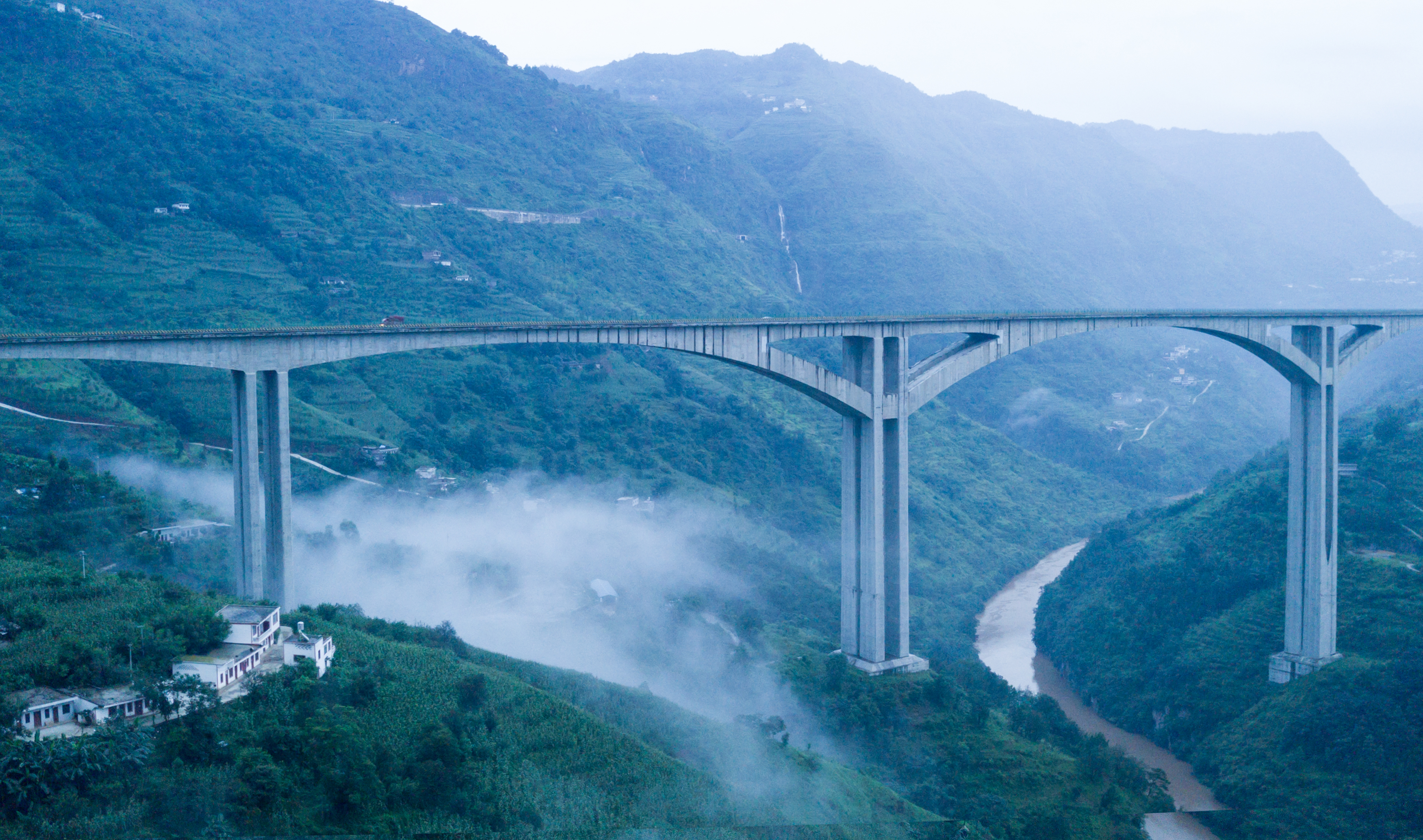 水盤高速公路北盤江特大橋全長1261m,主跨290m,是目前亞洲最大跨徑的預(yù)應(yīng)力混凝土連續(xù)(空腹式)斜腿剛構(gòu),被譽(yù)為“世界第一腿”。其空腹式結(jié)構(gòu)形式填補(bǔ)了跨徑在200~400m之間缺乏經(jīng)濟(jì)適用橋型的空白;研發(fā)了“下弦采用斜爬掛籃結(jié)合臨時(shí)扣掛系統(tǒng)懸澆,上弦采用支架結(jié)合移動(dòng)模架滯后下弦節(jié)段現(xiàn)澆”部級施工方法,并研制了大傾角、變曲率、可斜向行走的上置斜爬式掛籃國家發(fā)明專利。大橋于2013年8月16日建成通車。